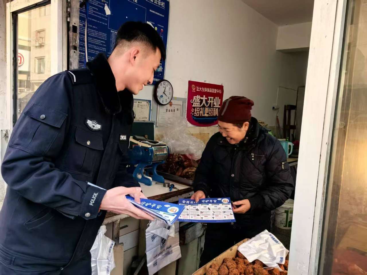 来集市购买年货的王大爷拉着民警的手说:“你们为了我们的安全,这么辛苦地工作,我们都看在眼里,记在心上。以后我们一定会积极配合你们的工作,共同维护好辖区的安全稳定。”
